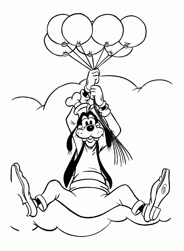 Goofy Flying to the Clouds with Balloons coloring page